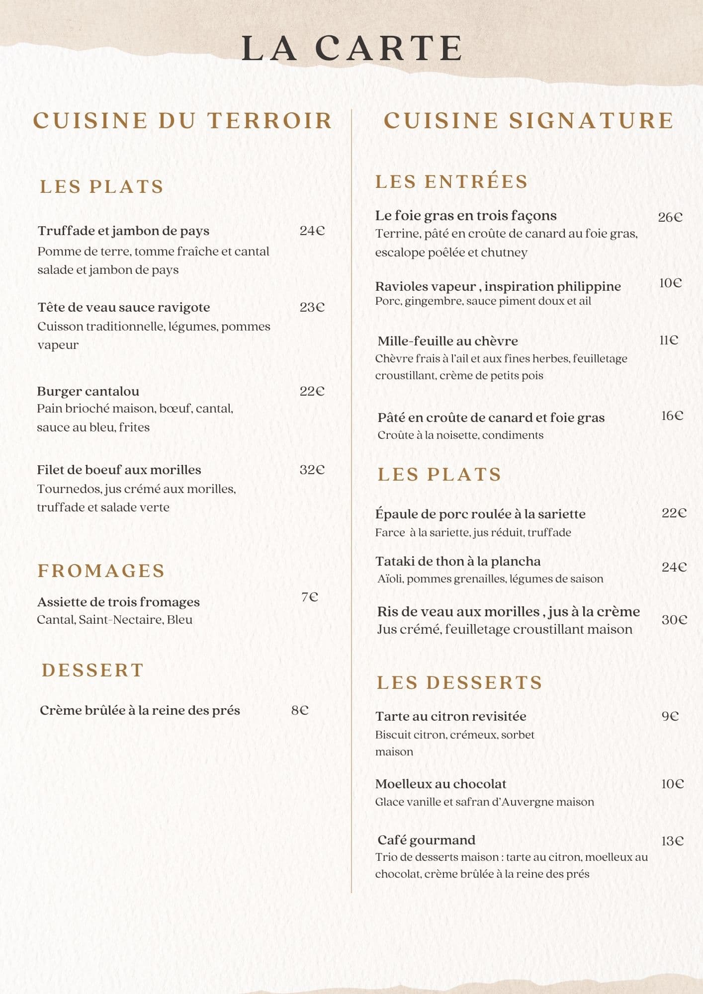 Notre restaurant à Champs-sur-Tarentaine, près de Bort-les-Orgues et du Château de Val, propose une cuisine maison mettant à l’honneur les produits du terroir du Cantal.